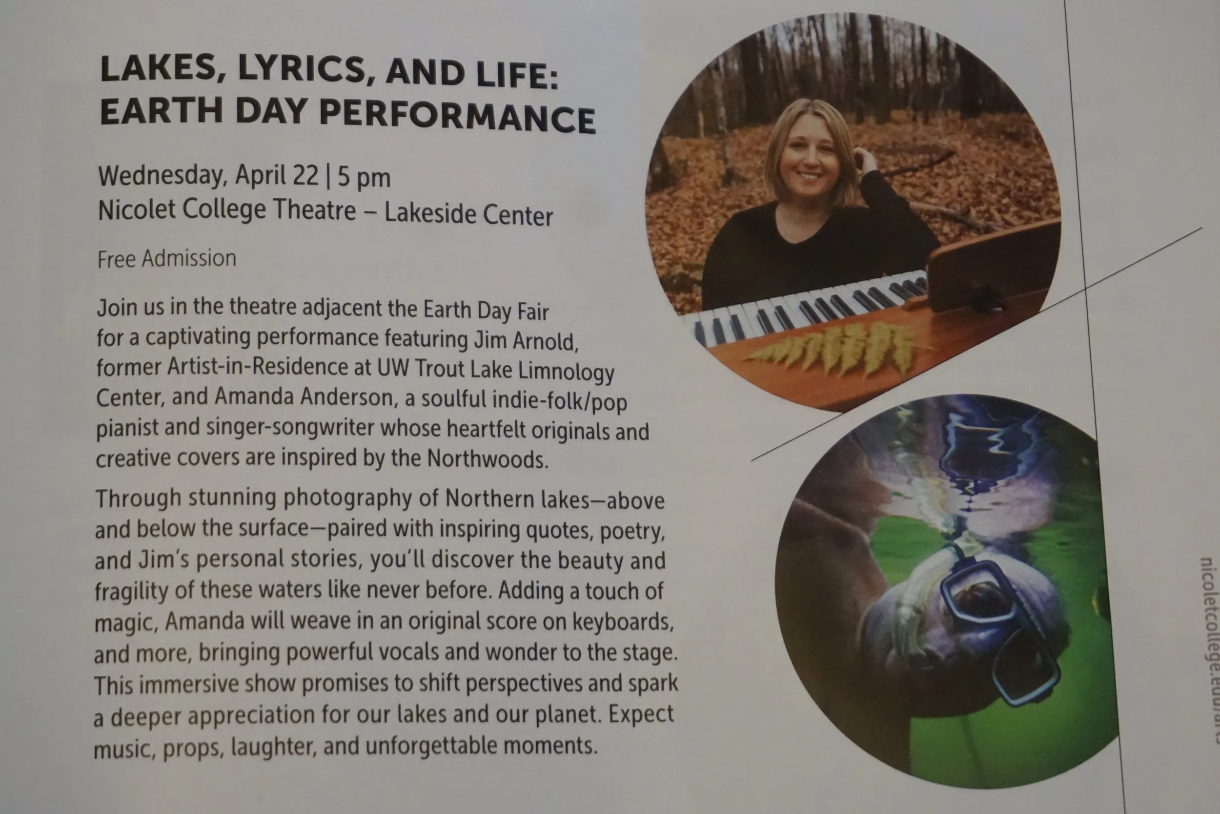 If you would like to celebrate Earth Day on April 22nd, come out and see my show Lakes, lyrics and life at Nicolet College